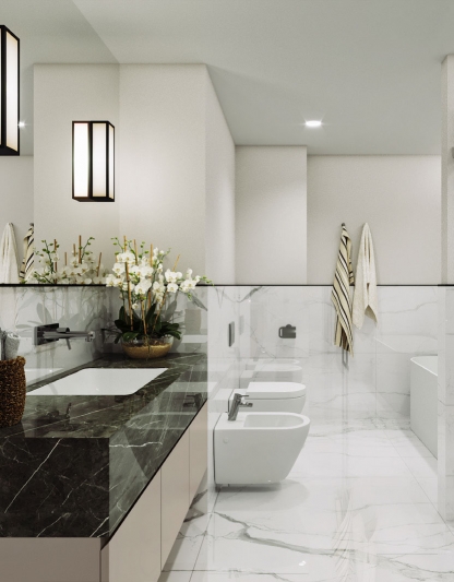 Kako se udobnost zasniva na kvalitetu i pouzdanosti, obezbeđena je vrhunska kupatilska oprema renomiranih proizvođača: Hansgrohe baterije, Villeroy&Boch sanitarije i Florim pločice.