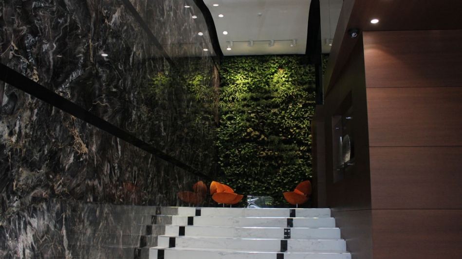 Zidovi i podovi ulaznog hola kao i stepeništa biće materijalizovani po posebnom projektu enterijera, koji uključuje kombinaciju kamena, stakla, drveta i "zelenog zida". Podovi enterijera poslovnog prostora, biće obloženi "HEUGA" podnim oblogama. Vrata i ograde biće izrađeni u kombinaciji stakla i prohroma, u skladu sa savremenim dizajnerskim rešenjima. Toaleti će biti opremljeni italijanskom granitnom keramikom i sanitarijom, kao i galanterijom HANSGROHE. S obzirom da je poslovni prostor projektovan u sistemu "open space" postoji mogućnost projektovanja delova enterijera prema potrebama zakupca u skladu sa mogućnostima objekta.